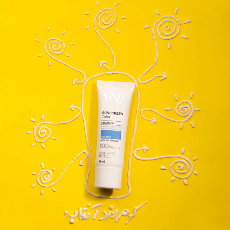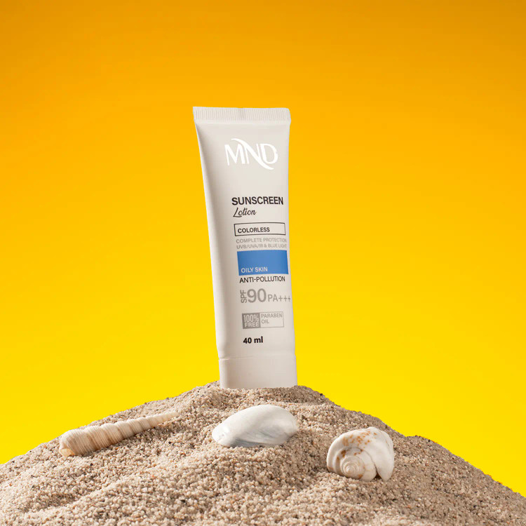 افراد دارای پوست چرب نیز باید از محصولات ضدآفتاب برای محافظت از پوست خود استفاده کنند و لوسیون ضدآفتاب بی رنگ با فاکتور حفاظتی 90 برند MND برای این افراد و بدون روغن تولید شده است. در این لوسیون از فیلترهایی استفاده شده که قادرند از ورود اشعههای UVA و UVB خورشید به پوست جلوگیری کنند. در کنار این ترکیبات، از عصاره ساقه/برگ/گل لادن به منظور جلوگیری از تاثیر مخرب نور آبی ساطع شده از وسایل الکترونیکی پیرامون انسان بر پوست و عصاره علف هفتبند برای ممانعت از آسیب دیدن فیبرهای پروتئینی پوست توسط اشعه مادون قرمز کمک گرفته شده است تا پوست به صورت کامل در برابر انواع طیفهای نوری محافظت شود. این محصول ترکیباتی مانند زینک پیسیای، پیریدوکسین فسفات حلقوی و عصاره برگ به را نیز در خود دارند که با کاهش دادن ترشح سبوم (چربی طبیعی سطح پوست) موجب بهبود شرایط پوست چرب میشوند. همچنین این محصول حاوی عصاره گل کاملیا ژاپنی را نیز میباشد که تولید ترکیبات التهابی توسط ذرات معلق و فلزات سنگین را کاهش میدهد و به همین دلیل این محصول قادر به حفاظت موثر از پوست در برابر آلودگی محیطی است.