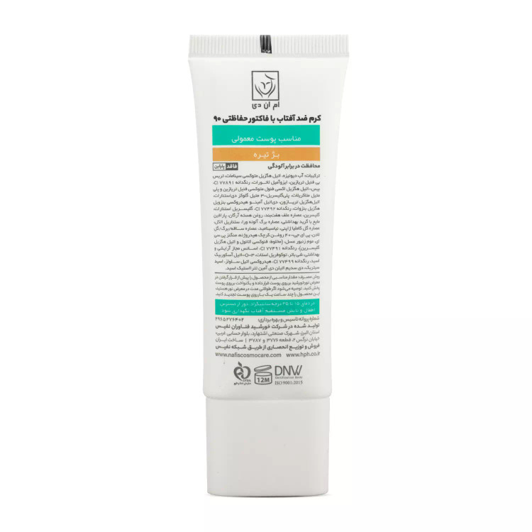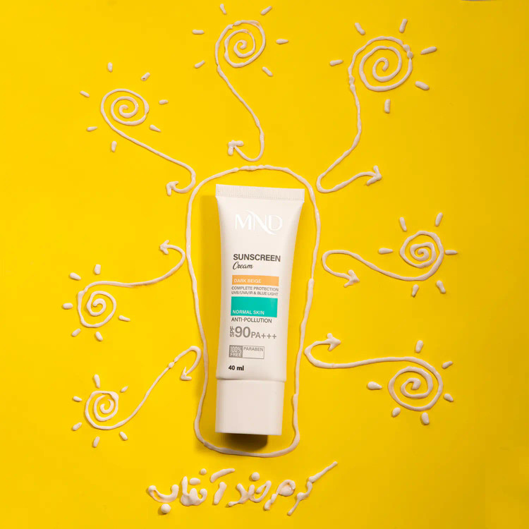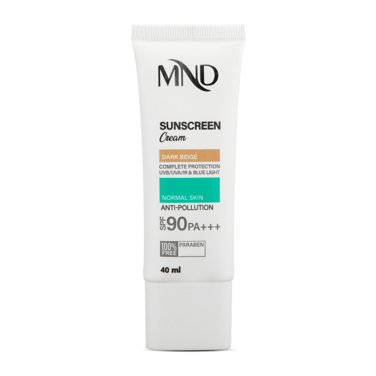 کرم ضدآفتاب بژ تیره با فاکتور حفاظتی 90 برند MND برای پوستهای معمولی تهیه شده است و فیلترهای استفاده شده در آن قابلیت جلوگیری از ورود اشعههای UVA و UVB خورشید به پوست را دارند. همچنین در این محصول، از عصاره علف هفتبند برای جلوگیری از اثر تخریبی اشعه مادون قرمز بر روی فیبرهای پروتئینی پوست و عصاره ساقه/برگ/گل لادن برای ممانعت از اثرگذاری سوء نور آبی ساطع شده از وسایل الکترونیکی پیرامون انسان بر پوست کمک گرفته شده است تا محافظت کاملی از پوست در برابر طیف وسیعی از اشعهها، حاصل شود. علاوه بر اینها از منگنز پیسیای، نیاسینامید (ویتامین ب 3) و مشتقات پایدار ویتامین سی برای تقویت و ارتقا سلامت پوست کمک گرفته شده که به همراه عصاره آلوئهورا موجب حفظ جوانی و شادابی پوست میشوند. روغن مورد استفاده در این کرم ضدآفتاب، روغن هسته آرگان میباشد که ترکیب متعادلی از انواع اسیدهای چرب را در خود داشته و به خوبی نیازهای پوست نسبت به اسیدهای چرب را تامین میکند. با توجه به اینکه محصولات ضدآفتاب اکثرا در محیط بیرون منزل مورد استفاده قرار میگیرند، از عصاره گل کاملیا ژاپنی نیز در این کرم استفاده شده تا ذرات معلق و فلزات سنگین موجود در محیط پیرامون افراد نتوانند با تولید ترکیبات آسیبزا و التهابی به پوست آنها آسیب برسانند.