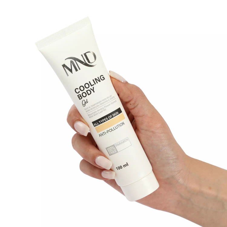 ژل خنککننده پوست MND حاوی منتول و روغن برگ نعناع وحشی است که با درگیرکردن گیرندههای حسی پوست باعث کاهش احساس درد در عضلات، مفاصل و ... میشود. همچنین از روغن پونه نیز در محصول استفاده شده است تا محصول بتواند بهتر التهاب و قرمزی پوست را کاهش داده و از خشک شدن پوست بعد از استفاده از ژل جلوگیری شود. با توجه به اینکه عصاره گل آرنیکا کوهی از عصارههای بسیار موثر در کاهش التهاب میباشد از این عصاره بسیار مفید نیز در محصول کمک گرفته شده است تا مکمل فعالیت خنککنندگی سایر اجزای فرمولاسیون مانند منتول باشد. با توجه به اینکه احتمال دارد پوست بعد از تجربه خنکی نسبت به عوامل پیرامونی حساس شده باشد از عصاره جوانه شاهی نیز در محصول استفاده شده است تا پوست در برابر عوامل پیرامونی محافظت شده و در برابر آنها مقاوم باشد.